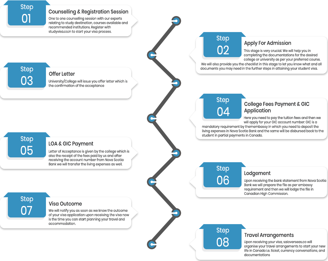 Here you need to pay the tuition fees and then we will apply for your GIC account number: GIC is a mandatory requirement by themembassy in which you need to deposit the living expenses in Nova Scotia Bank and the same will be disbursed back to the student in partial payments in Canada.